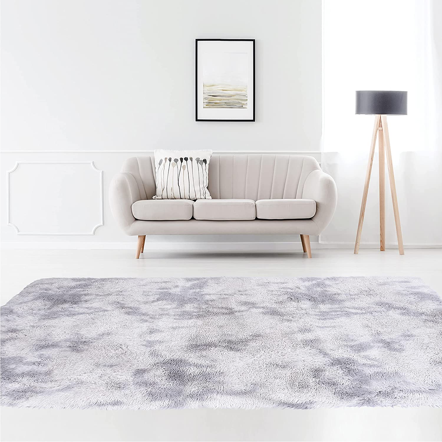 Tie Dye Shaggy 5x7 Light Grey Area Rug - Fluffy Area Rug for Living Room, Bedroom, and Nursery - Plush Faux Fur Carpet for Modern Home Decor and Room Aesthetic