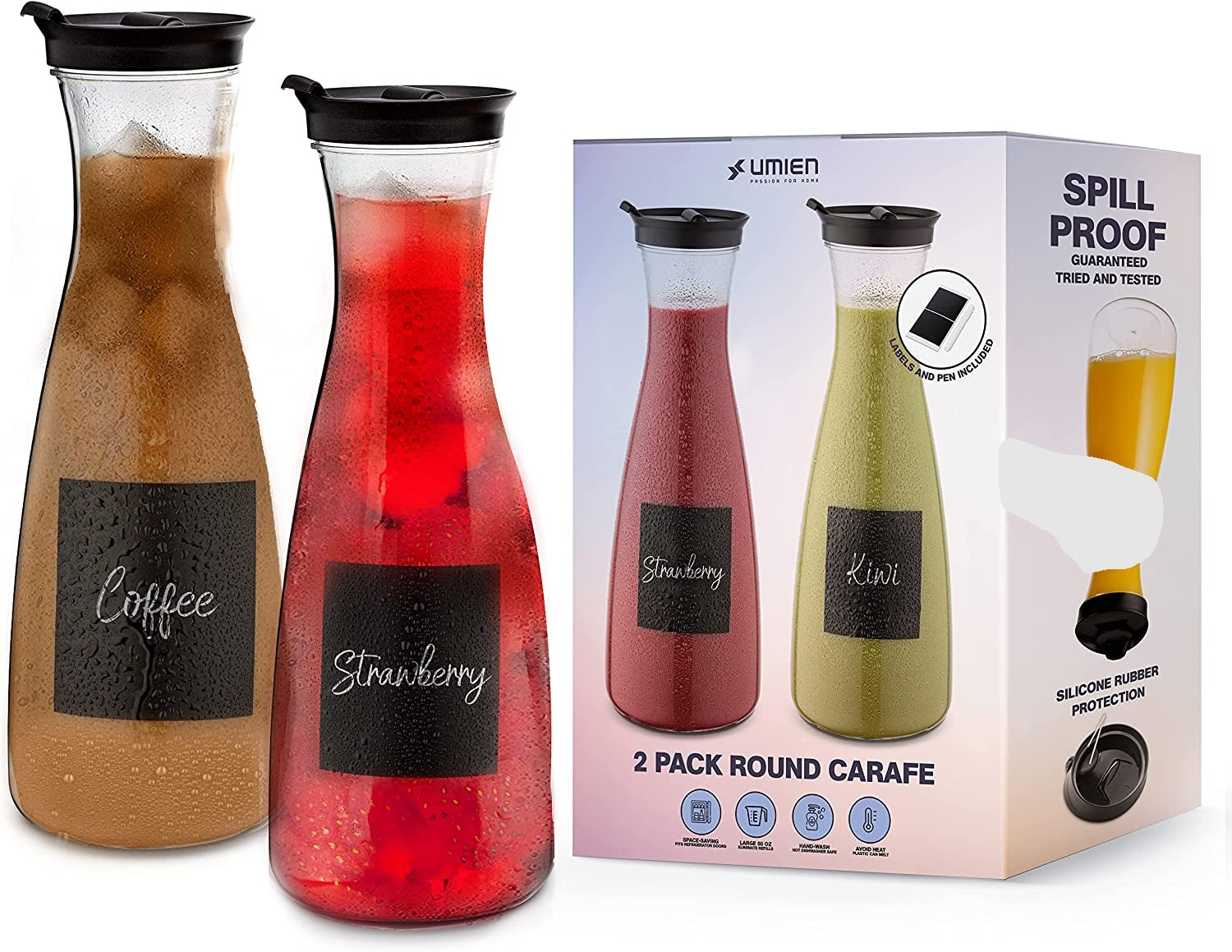 - 【 Elegant Carafe Pitchers 】 – These drink pitchers feature classy black lid covers and a clear base that will look awesome with any décor. Choose between our stylish square or round base designs. Whether you are serving your guests at a party, or simply need a place to store your beverages, the UMIEN Carafe Pitcher is the answer!