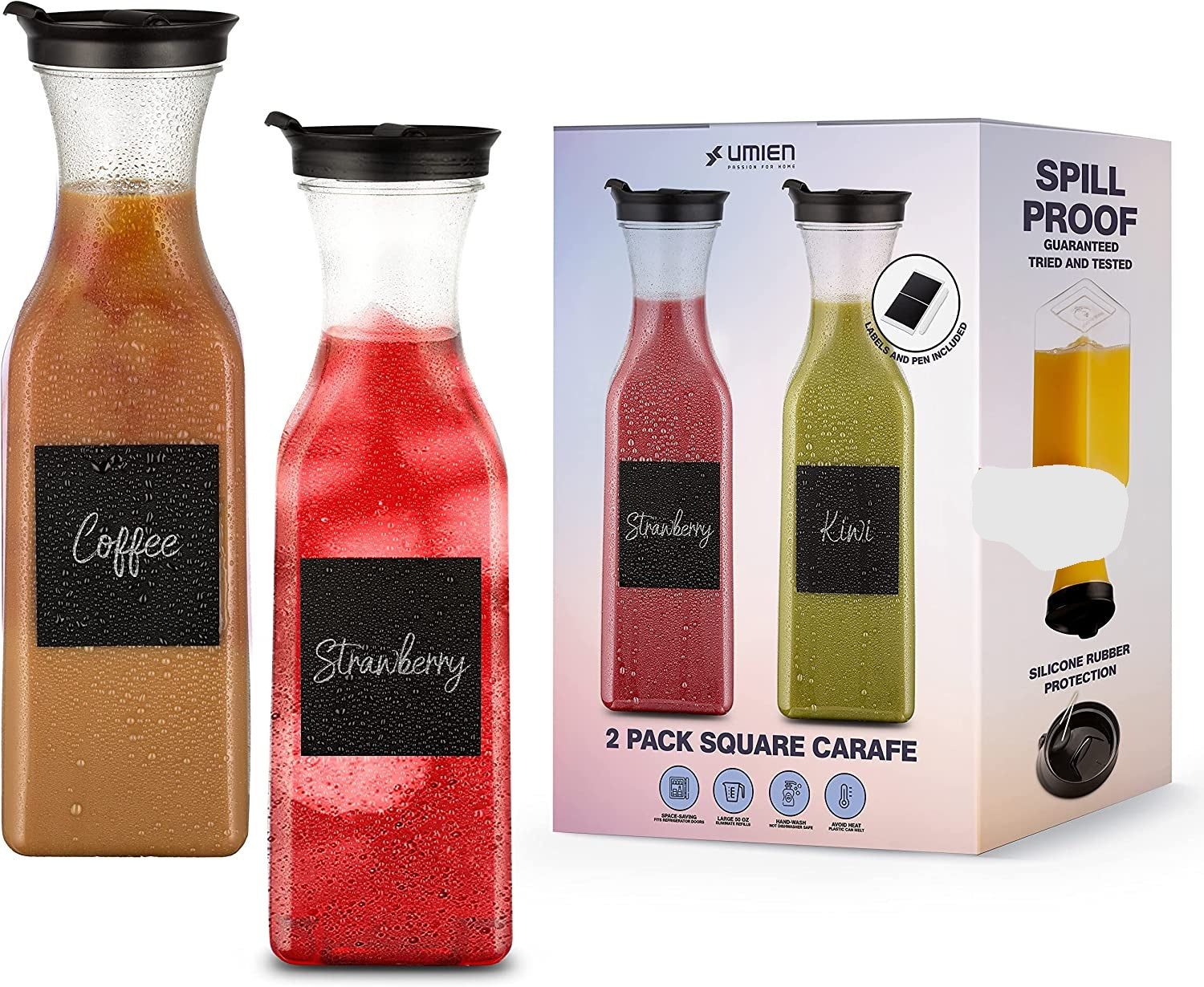 - 【 Elegant Carafe Pitchers 】– These drink pitchers feature classy black lid covers and a clear base that will look awesome with any décor. Choose between our stylish square or round base designs. Whether you are serving your guests at a party, or simply need a place to store your beverages, the UMIEN Carafe Pitcher is the answer!